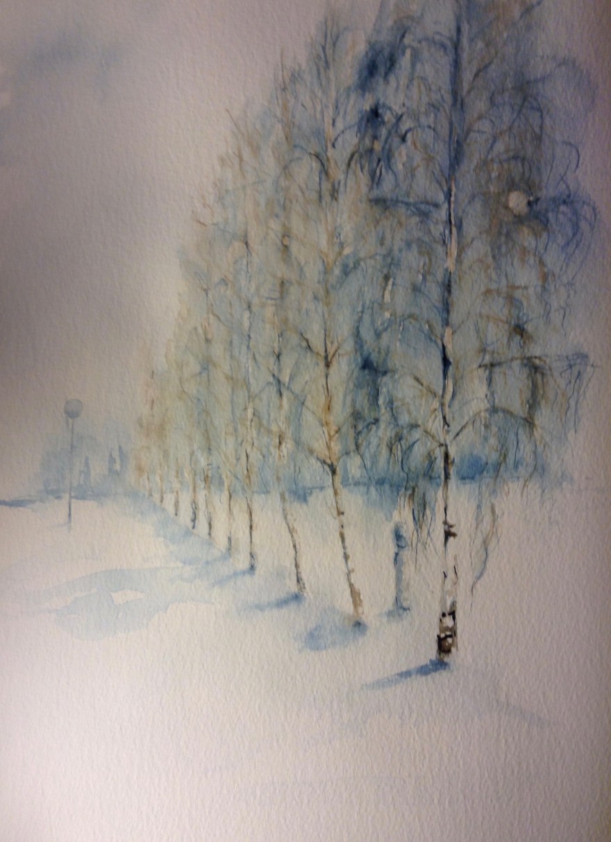 My daughter was the source of inspiration for this painting. One of her photos captured the stark beauty of the town in snow.